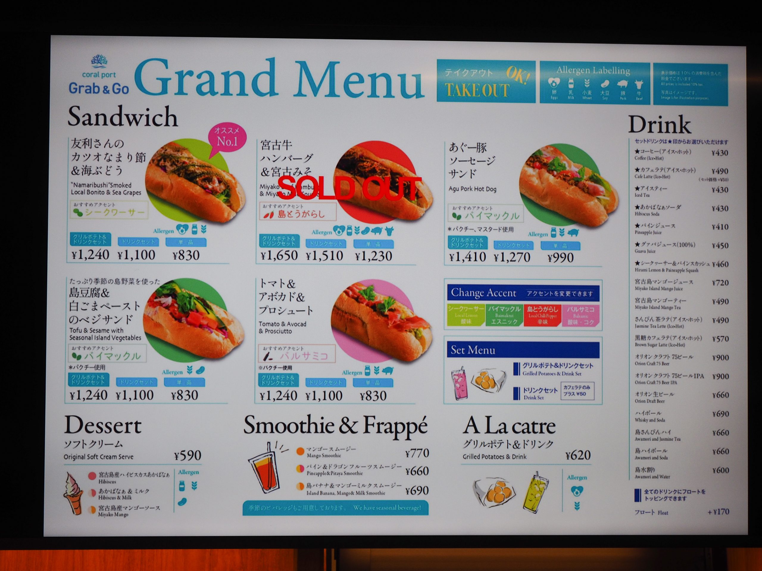 下地島機場航廈內,擁有寬敞舒適的用餐空間,不論是到達後、離開前在這邊用上一餐,會是最好的充電方式。go2miyako推薦其中一家「Grab&GO」Sandwich,不只適合你在短時間內補足能量,製作上更是採用了大量的在地食材,如:海葡萄、宮古牛、阿古豬、島豆腐等等島料理、野菜。不論你是即將出境返家、或者是剛剛到達宮古島,這趟味蕾與宮古島的邂逅旅程你絕對不能錯過!如果天氣許可,在戶外空間用餐也有另一種悠哉感,仔細探索機場,還能發現用心經營的彩繪牆面。